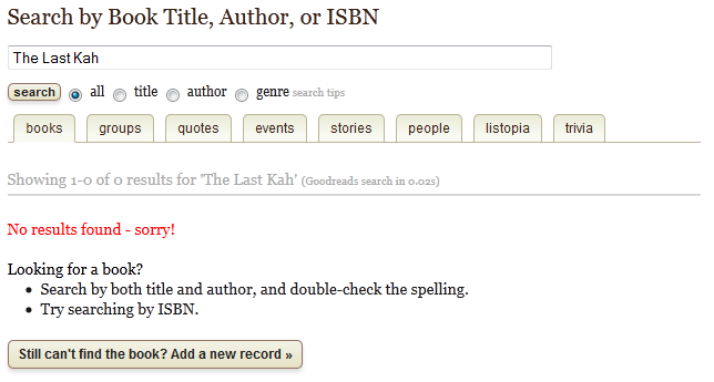 IUn optimized book profilef the goodreads librarians have not added the basic book information (cover photo, blurb, year of publication, ISBN), then start here and then work on the rest. The worst thing that can happen is if your book is not even visible on goodreads. Search for your title. If you see something like this image, you need to manually add your book yourself.