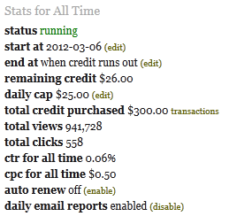 advertisingTo illustrate, I have been advertising on goodreads since last March. I set up a $300 initial advertising investment and began experimenting with different ad copy and targeting options. Since last March, my ads have been viewed 940,000 times, clicked on 558 times, and my book has been added to 2,500 shelves. I have only been charged for the 558 clicks, not the books added, and I have yet to exhaust my initial $300 investment. Despite these benefits, a fair criticism of the goodreads ads mechanism is that the number of views are wildly variable. Some days the ad is shown thousands of times, and others it may not be shown at all, without any rhyme or reason. I would only recommend dabbling in advertising if you have a good working understanding of cost per click advertising and more importantly have free cash flow to invest.